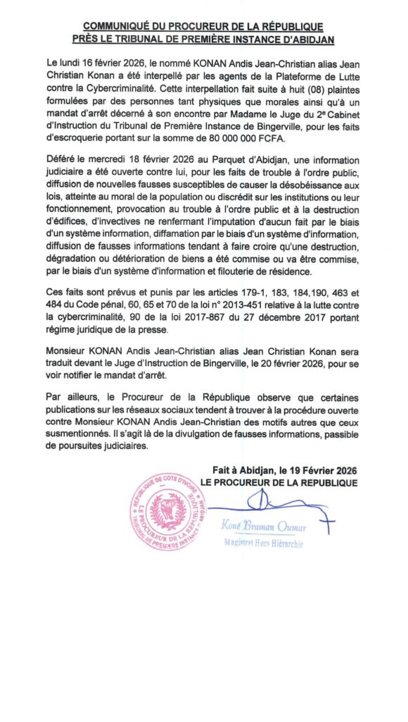 Cette interpellation fait suite à huit (08) plaintes formulées par des personnes tant physiques que morales ainsi qu’à un mandat d’arrêt décerné à son encontre par Madame le Juge du 2o Cabinet d’Instruction du Tribunal de Première Instance de Bingerville, pour les faits d’escroquerie portant sur la somme de 80 000 000 FCFA. Déféré le mercredi 18 février 2026 au Parquet d’Abidjan, une information judiciaire a été ouverte contre lui, pour les faits de trouble à l’ordre public, diffusion de nouvelles fausses susceptibles de causer la désobéissance aux lois, atteinte au moral de la population ou discrédit sur les institutions ou leur fonctionnement, provocation au trouble à l’ordre public et à la destruction d’édifices, d’invectives ne renfermant l’imputation d’aucun fait par le biais d’un système information, diffamation par le biais d’un système d’information, diffusion de fausses informations tendant à faire croire qu’une destruction, dégradation ou détérioration de biens a été commise ou va être commise, par le biais d’un système d’information et filouterie de résidence.», lisons-nous dans le communiqué du Procureur ce jeudi soir.