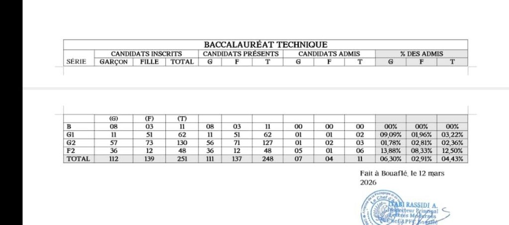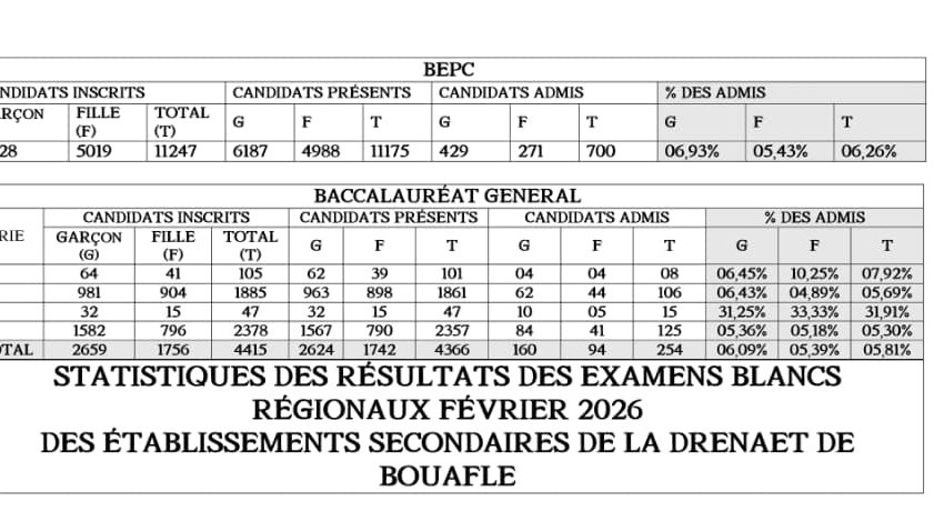 Les résultats des examens blancs 2026 dans la localité de Bouaflé viennent de tomber. Les résultats alimentent énormément la polémique puisqu’ils sont largement en déça des attentes. Pour le BEPC blanc, la DRENA de Bouaflé enregistre un peu plus de 6% d’admis, sur plus de 11000 candidats présents en salle.