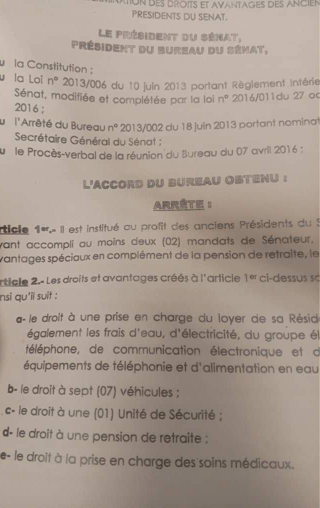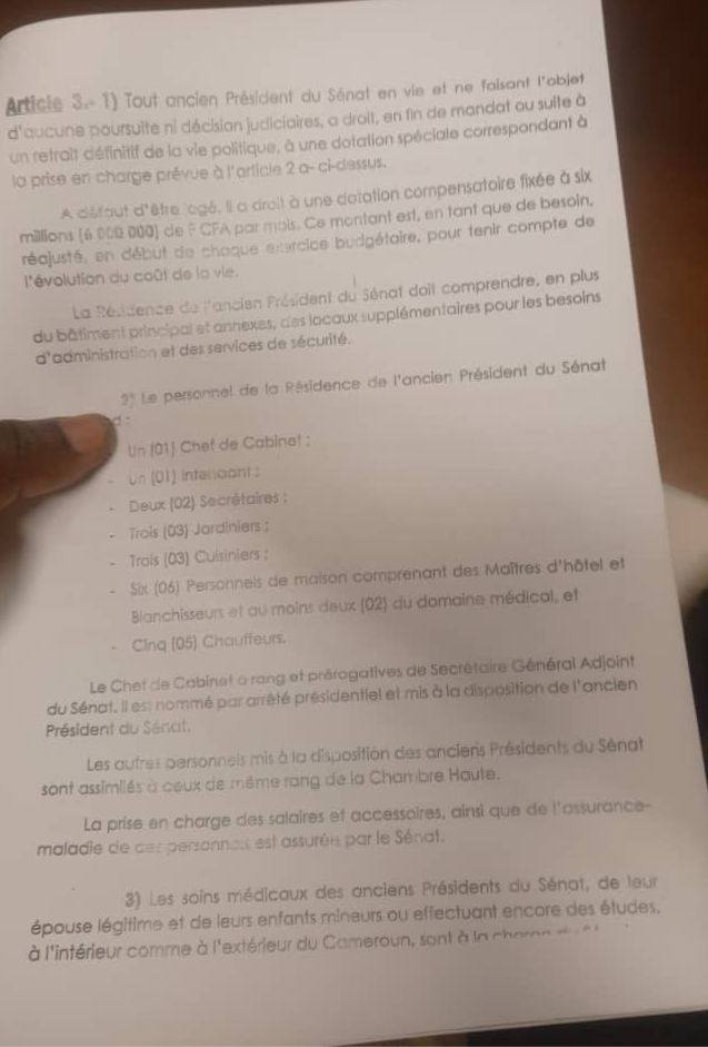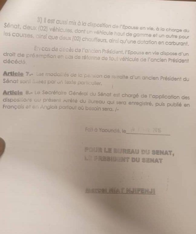 Elle bénéficie également d’une dotation en carburant pour ses deux véhicules. Pour ses dépenses de souveraineté, l’ancien président du sénat camerounais bénéficie d’une dotation financière mensuelle de 20 millions de FCFA pour les dépenses liées à sa souveraineté. Sa pension de retrait est quant à elle, fixée au ¾ des émoluments du président de la chambre Haute du Parlement. Au Cameroun, la publication des privilèges ahurissants de Marcel Niat Njifenji, une fois qu’il quittera la présidence du Sénat, suscitent une vive colère, d’autant plus que le pays est de plus en plus gangréné par la corruption, si l’on en juge par le dernier rapport de l’ONG Transparency International.