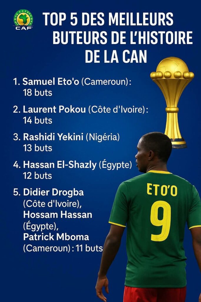 Il s’agit de l’attaquant des super eagle Rashidi Yekini. Classé parmi les légendes du football africain, l’avant-centre nigérian a inscrit 13 buts en coupe d’Afrique des Nations. Classé parmi les légendes du football ivoirien, Didier Drogba a marqué de son emprunte la coupe d’Afrique des Nations, même s’il jamais remporté ce trophée avec son pays. Le footballeur ivoirien affiche onze réalisations à son compteur dans cette compétition. Il est à égalité avec une autre légende du football camerounais, devenue aujourd’hui consultant sportif. Patrick M’Boma figure parmi les meilleurs buteurs de cette compétition avec onze buts à son compteur également.
