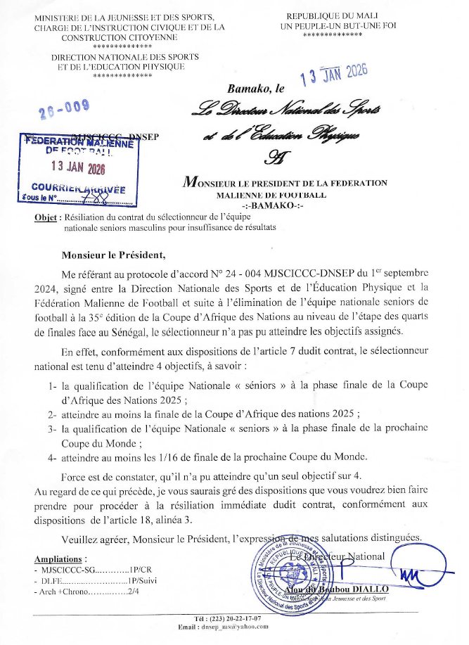 «Résiliation du contrat du sélectionneur de l’équipe nationale seniors masculins pour insuffisance de résultats. Monsieur le Président, Me référant au protocole d’accord N° 24-004 MJSCICCC-DNSEP du 1er septembre 2024, signé entre la Direction Nationale des Sports et de l’Éducation Physique et la Fédération Malienne de Football et suite à l’élimination de l’équipe nationale seniors de football à la 35° édition de la Coupe d’Afrique des Nations au niveau de l’étape des quarts de finales face au Sénégal, le sélectionneur n’a pas pu atteindre les objectifs assignés…