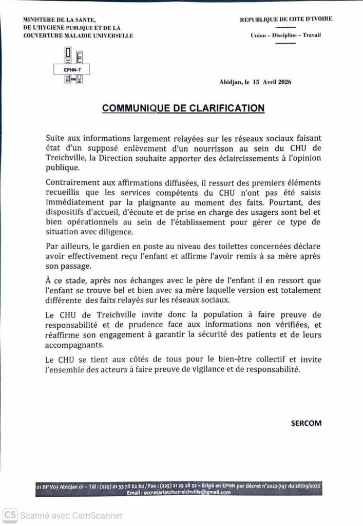 «Suite aux informations largement relayées sur les réseaux sociaux faisant état d’un supposé enlèvement d’un nourrisson au sein du CHU de Treichville, la Direction souhaite apporter des éclaircissements à l’opinion publique. Contrairement aux affirmations diffusées, il ressort des premiers éléments recueillis que les services compétents du CHU n’ont pas été saisis immédiatement par la plaignante au moment des faits. Pourtant, des dispositifs d’accueil, d’écoute et de prise en charge des usagers sont bel et bien opérationnels au sein de l’établissement pour gérer ce type de situation avec diligence.», indique la direction du CHU dans un communiqué officiel. Concernant le nourrisson, ce dernier serait désormais entre les mains de ses parents, en toute sécurité :