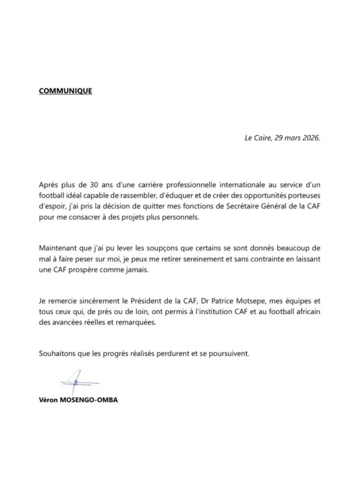 Veron Mosengo-Omba a démissionné de son poste de secrétaire général de la CAF qu’il occupait depuis quelques années. C’est ce dimanche 29 mars 2026 que le congolais a annoncé sa décision de quitter les hautes instances de la confédération africaine de football, une décision qui intervient en pleine bataille juridique entre la CAF et le Sénégal.
